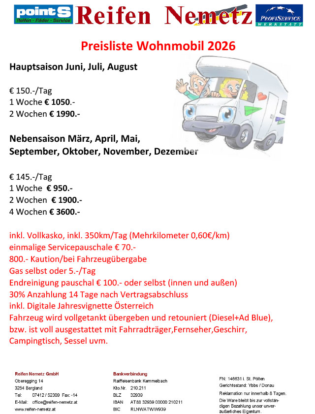 Bei Reifen Nemetz in Bergland im Bezirk Melk können Sie auch ein Wohnmobil für Ihren Urlaub mieten! Wir bieten Ihnen ein modernes Fahrzeug mit bester Ausstattung zu einem fairen Preis-Leistungs-Verhältnis an.